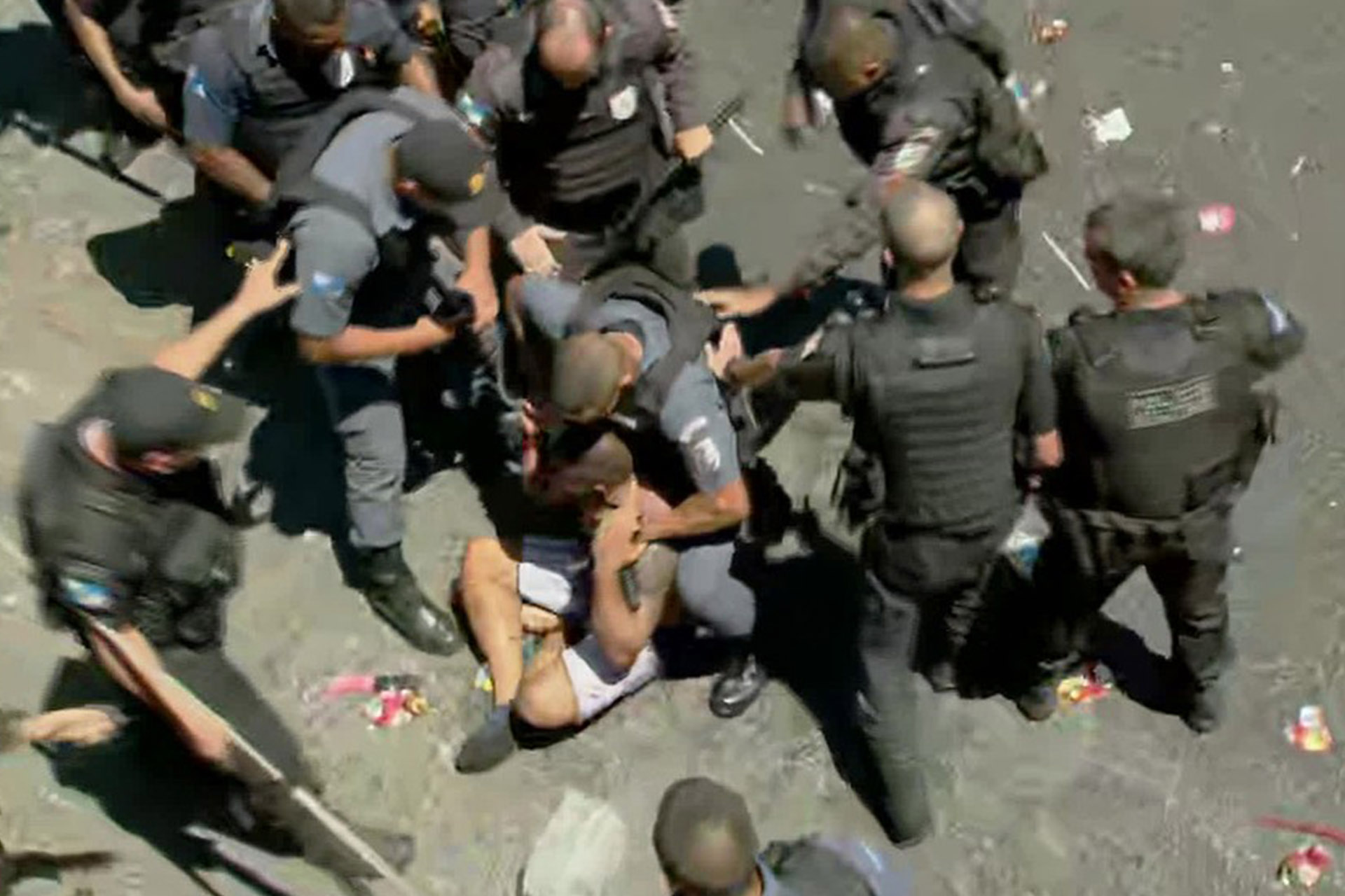 Um dos foliões que hostilizava a corporação foi cercado e espancado com cassetetes. Bastante machucado, o homem, que não teve a identidade revelada, foi levado de ambulância para o hospital, acompanhado por cinco policiais. A polícia tentou impedir que jornalistas registrassem a agressão. “Não tira foto para não se complicar”, disse um dos PMs.