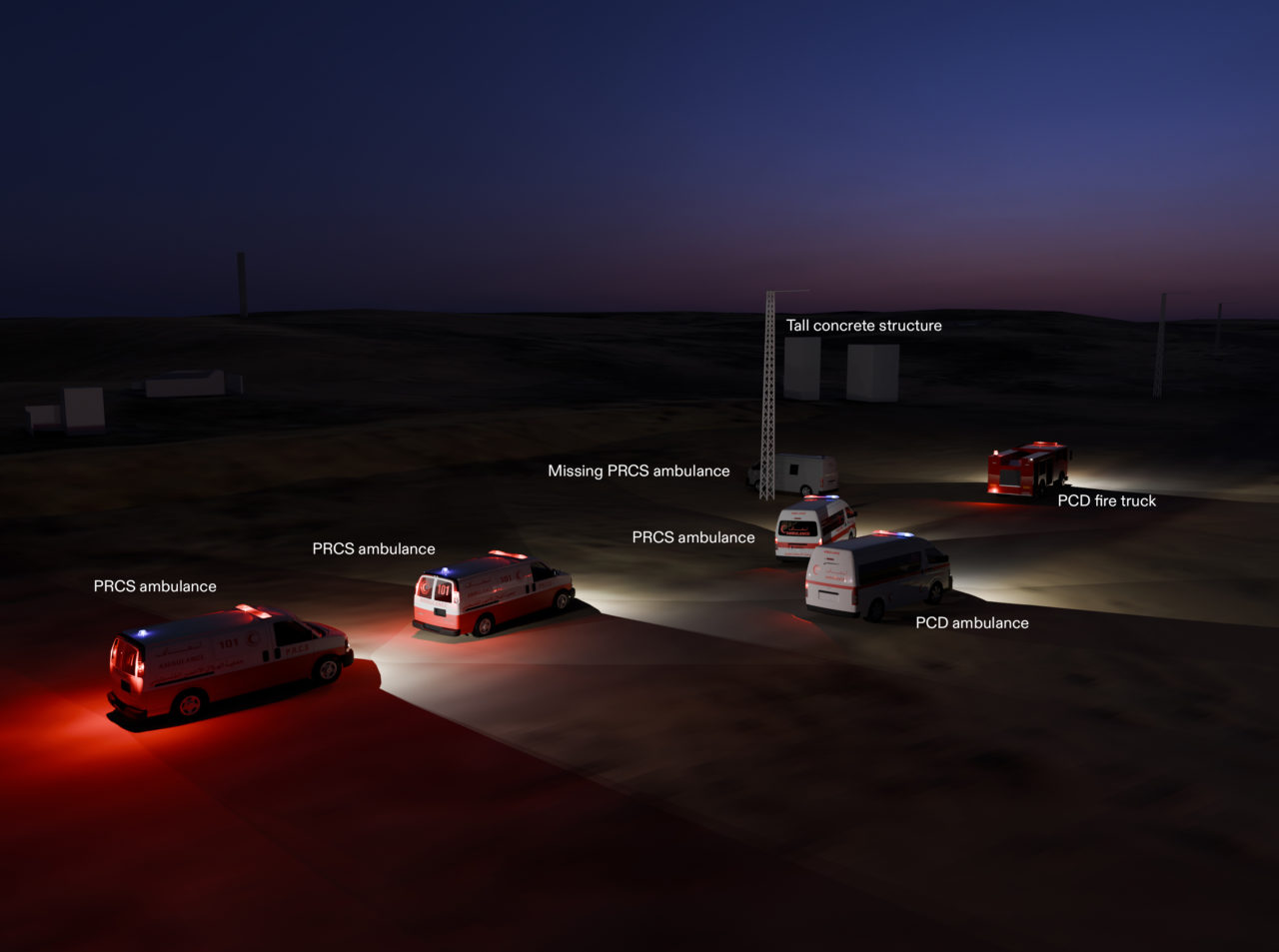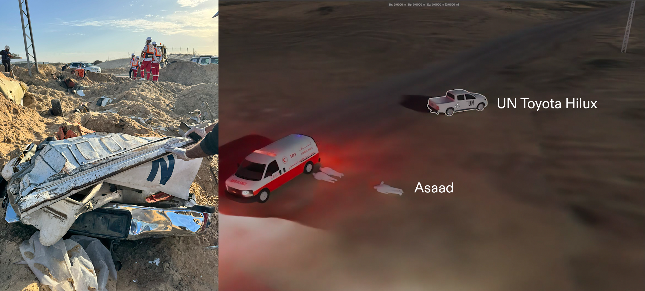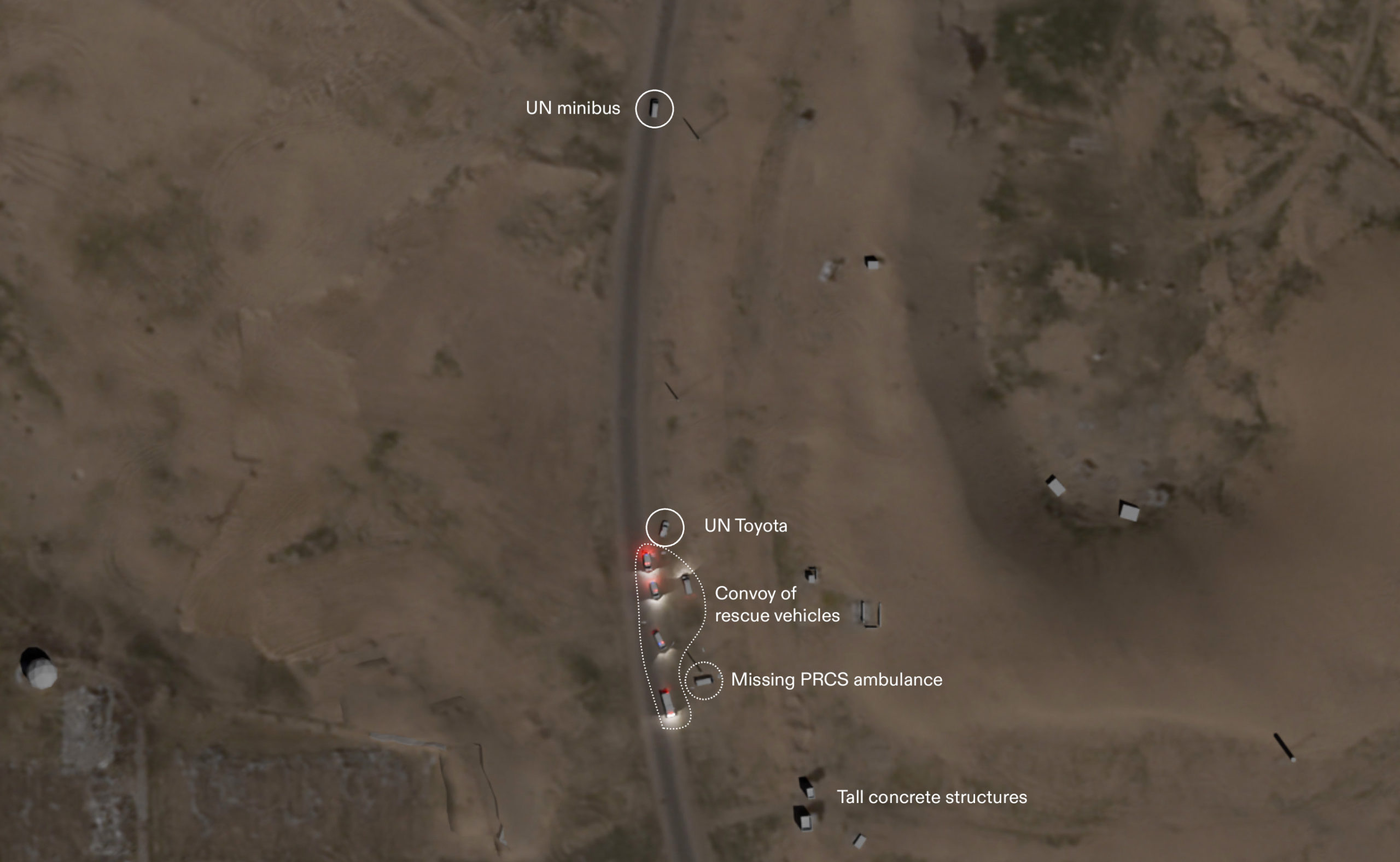 Às 5h09, quando os trabalhadores estacionaram e se aproximaram a pé da primeira ambulância, soldados israelenses posicionados no talude elevado abriram fogo. Uma reconstrução digital da cena mostra que os soldados teriam tido visão desobstruída da chegada do comboio. Abed, que estava detido sob a mira de arma no talude elevado, testemunhou que os soldados estavam ajoelhados e apontando suas armas para o comboio à medida que ele se aproximava.