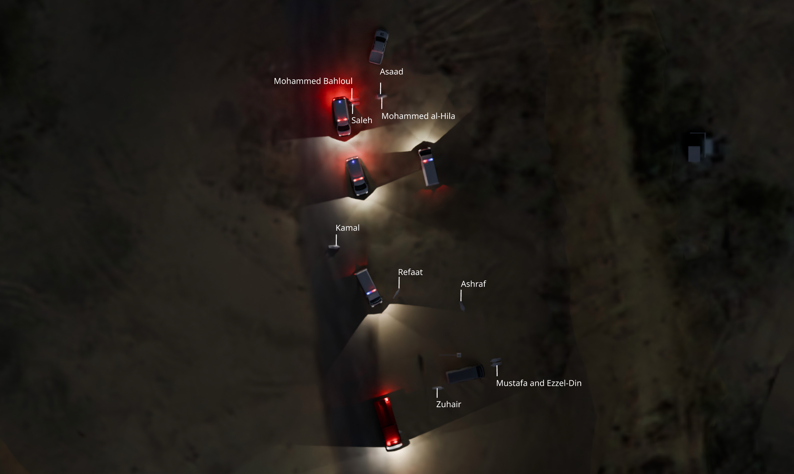 - Os soldados israelenses estavam inicialmente posicionados sobre um talude elevado de areia à beira da estrada, sem obstruções que limitassem sua linha de visão. As luzes de emergência e as marcações dos veículos das vítimas teriam sido claramente visíveis aos soldados no momento dos ataques.