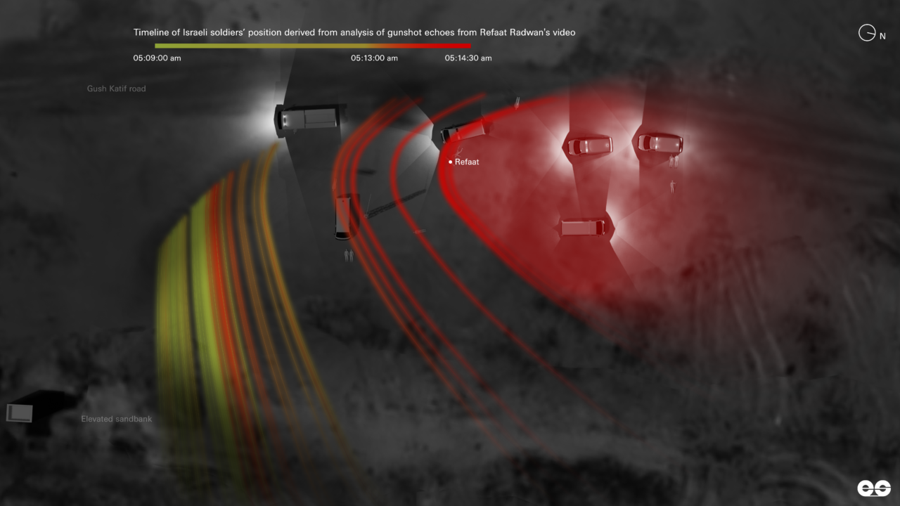A Earshot utilizou ecolocalização para analisar o áudio das gravações a fim de chegar a estimativas precisas da localização dos atiradores. Ecolocalização é o processo de localizar a origem de um som com base na análise de seus ecos e do ambiente pelo qual o som se propaga. O Exército israelense destruiu e removeu tantos edifícios na área de Tel Al-Sultan onde ocorreu a emboscada contra os trabalhadores humanitários que restaram pouquíssimas estruturas. Essa destruição, na verdade, reforçou a capacidade da Earshot de determinar as posições e os movimentos dos soldados israelenses, com base na identificação das superfícies responsáveis por ecos de disparos claramente distinguíveis. Em vez de múltiplos edifícios refletindo as ondas sonoras, havia apenas algumas paredes ainda de pé e os próprios veículos de emergência.